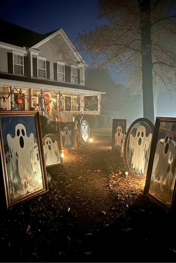 Install old or thrifted mirrors along the path — some hung from tree branches, others propped up on stands or crates. Distort a few using privacy film or paint ghostly figures on the surface. Light them dimly with string lights or hidden tea candles.