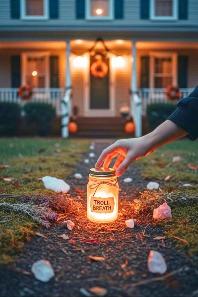 Along the trail, hide small labeled jars or vials filled with strange “ingredients”: dragon scale (glitter), bat wing (black fabric), troll breath (cotton balls). Give visitors a list and let them find them all to “complete a spell.”