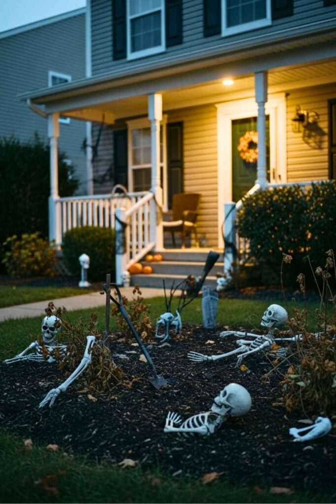 Plant old garden tools like shovels and rakes among skeleton parts half-buried in mulch or soil. Place trowels in bony hands and create scenes like “gardening gone wrong.” Scatter wilted fake flowers and creepy garden gnomes with blood-red eyes.