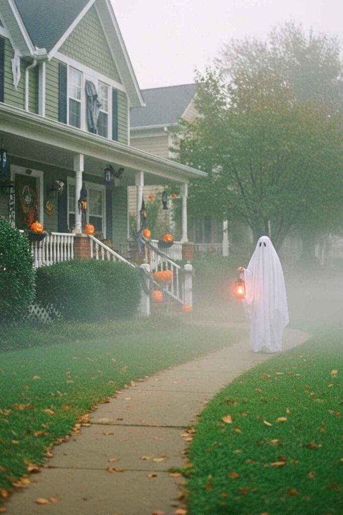 At the end of your trail, set up a lone figure: a ghostly mannequin draped in white fabric, holding a lantern, standing in silence. Add fog behind her, and perhaps the soft sound of a bell tolling. She doesn’t move. But she sees everything.