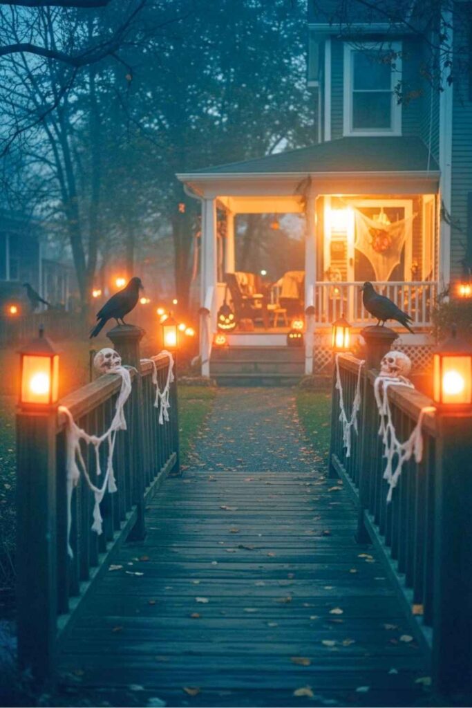 If your trail includes a small bridge or platform, this is your chance. Use fog machines, fake chains, and flickering lanterns. Add crows, ravens, or skulls perched on the railing. The crossing becomes a moment of tension and wonder.