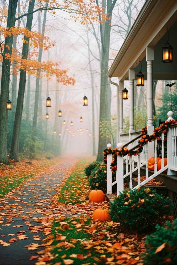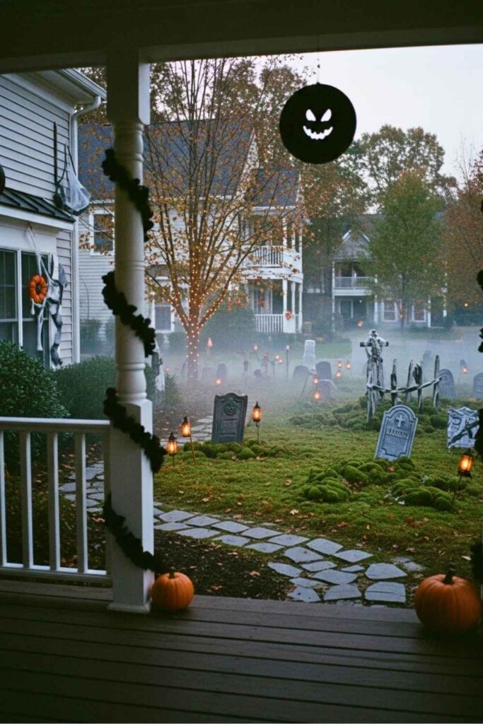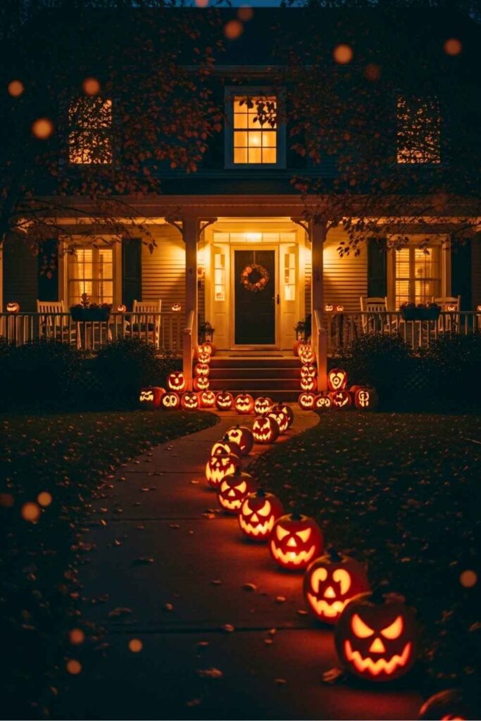 Line both sides of your trail with carved pumpkins — some smiling, some sinister. Place tea lights inside and space them out so their glow flickers just enough to keep people wondering which ones are “alive.” Paint a few white or green for ghostly effect.