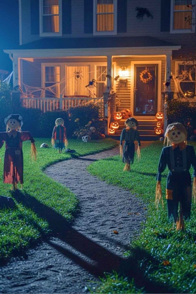Line a path with scarecrows made from old clothes stuffed with straw, burlap sacks for heads, and floppy hats. Vary their posture — some slumped, some standing tall, one kneeling with a pumpkin in its lap. Use floodlights from below to make their shadows stretch.