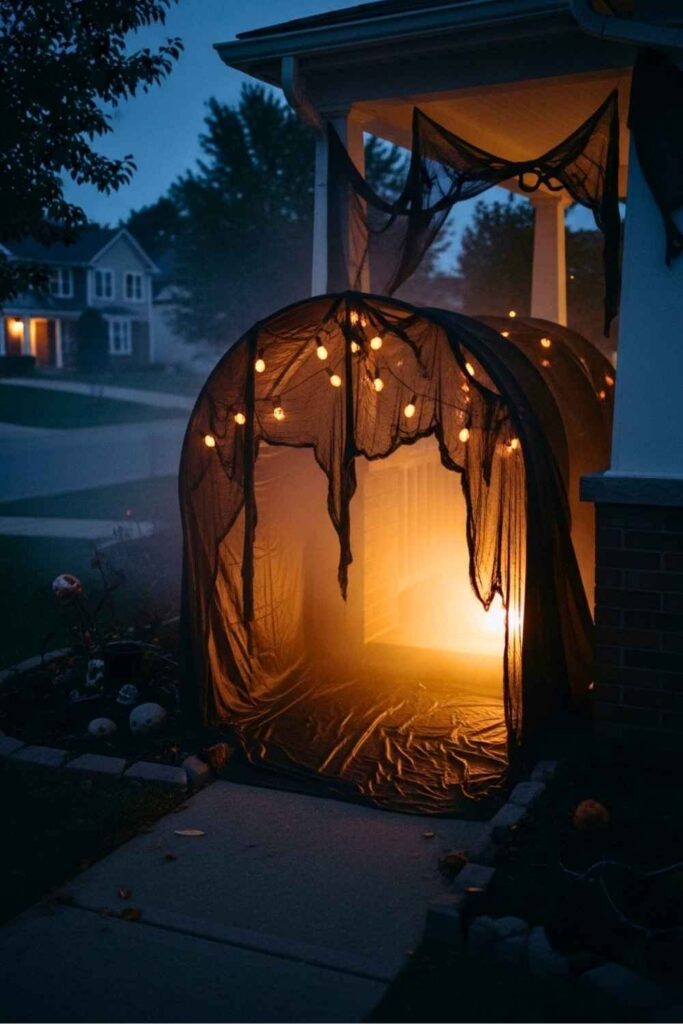 Build a narrow hallway or tunnel using PVC pipes and black fabric or tarp. Hang strips of torn gauze, old curtains, or cheesecloth from the top so they brush against people’s faces as they walk through. Use red or purple lighting from the base to make it feel otherworldly.