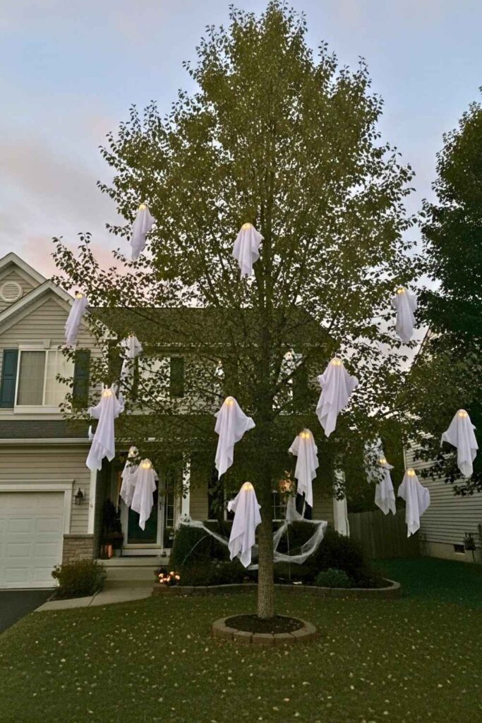 These ghosts dance with the wind and create a hauntingly beautiful effect. It’s an easy DIY project with a powerful visual result, especially at night.
