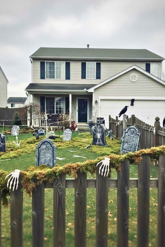 Install a small faux wrought iron fence around a section of your yard and fill it with tombstones, hands coming out of the ground, and maybe a ghost or two. Add moss, dirt mounds, and a crow or raven prop for realism.