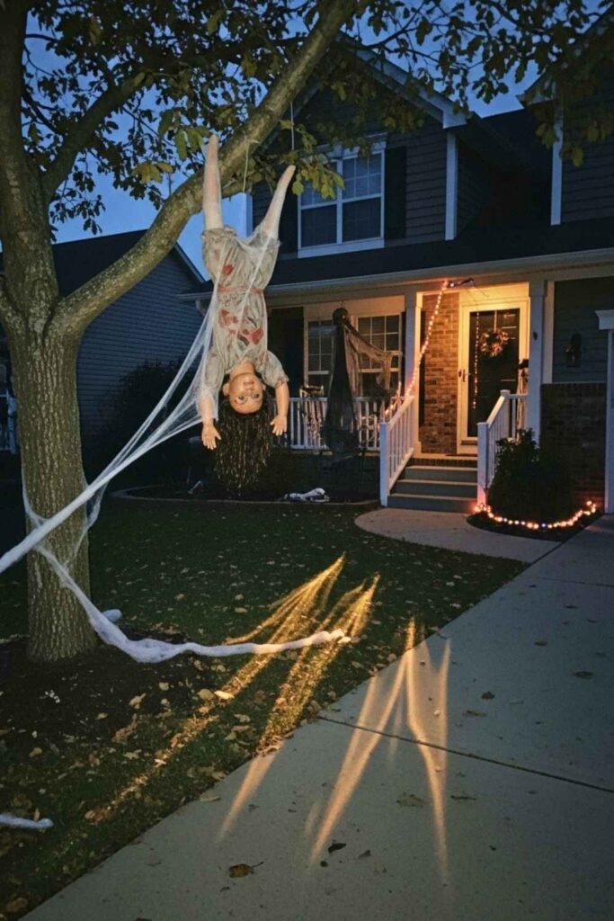 Suspend life-sized dolls or figures upside down from tree branches or porch beams, wrapped in spider webbing like prey. Make them look like they’re being dragged upward by unseen forces. Use limbs that hang loosely and eyes that glow for that extra-creepy look.