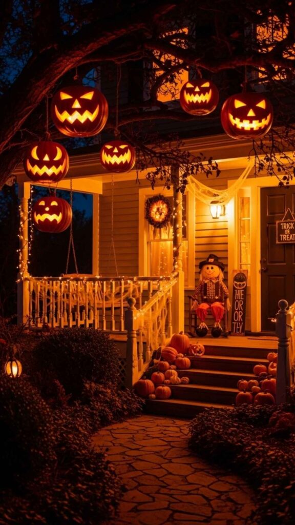 Line your walkway with carved pumpkins glowing from within. Choose a mix of classic jack-o’-lantern faces and celestial carvings — moons, stars, and pentacles — to guide guests with a whimsical, slightly eerie feel. Use flameless LED candles inside for safety and longevity.