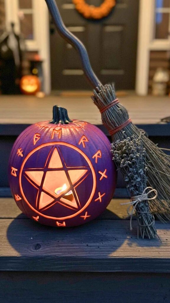 A pentacle isn’t just a symbol — it’s a protective charm, especially when glowing at your doorway. Draw a five-pointed star inside a circle on your pumpkin, using a ruler or straight edge to keep the lines precise.