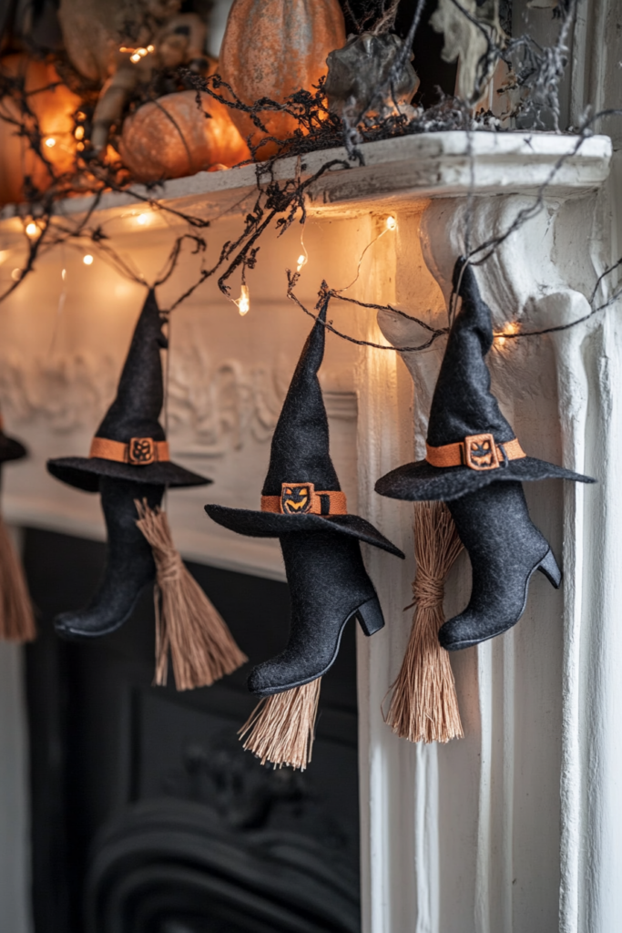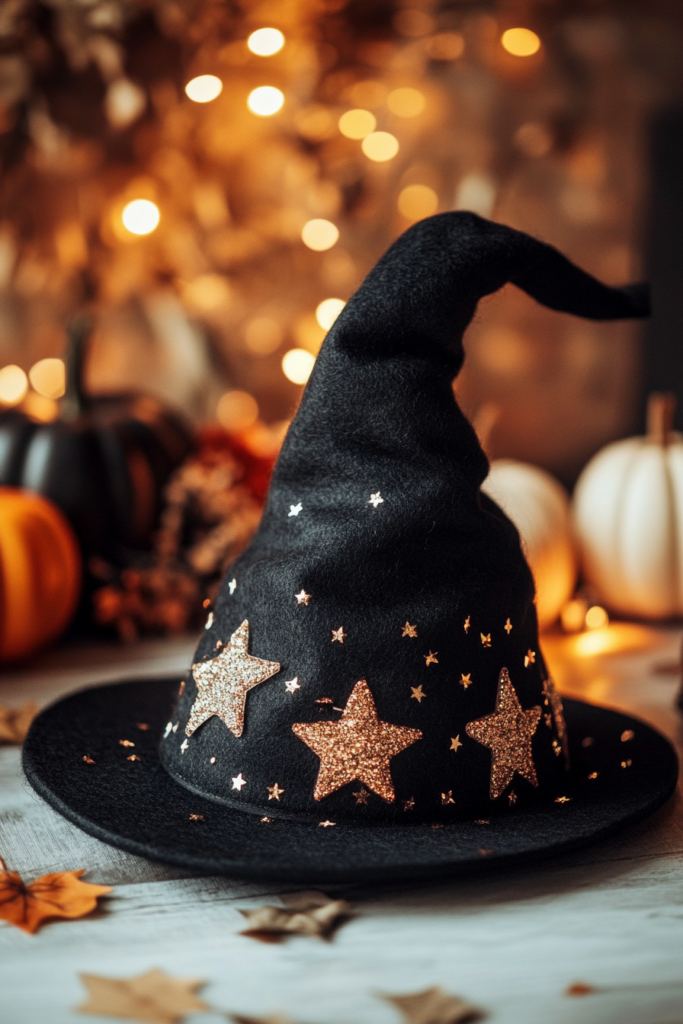1. Floating Witch Hats: Hang witch hats from the ceiling at varying heights to create a whimsical and eerie effect.