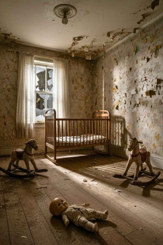 A rocking horse creaks softly in the corner, and faded wallpaper peels away with time. Toys are scattered as if waiting for children who never returned.