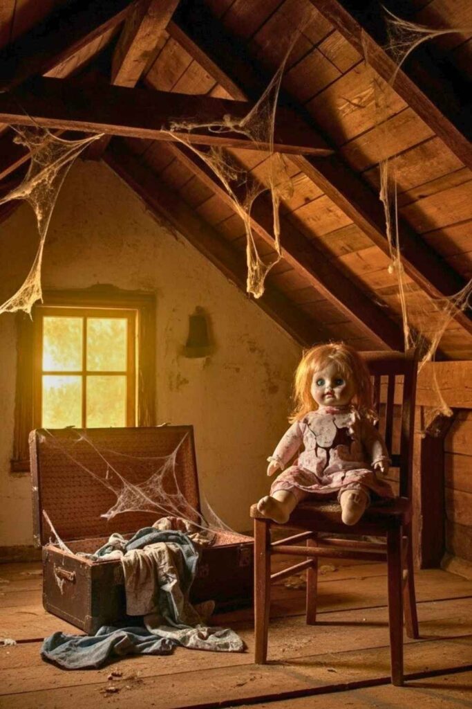 Fill your attic with old trunks, broken lamps, and cracked porcelain dolls sitting on dusty shelves. Scatter old letters and faded family portraits, so it feels like you’re intruding on someone else’s past.