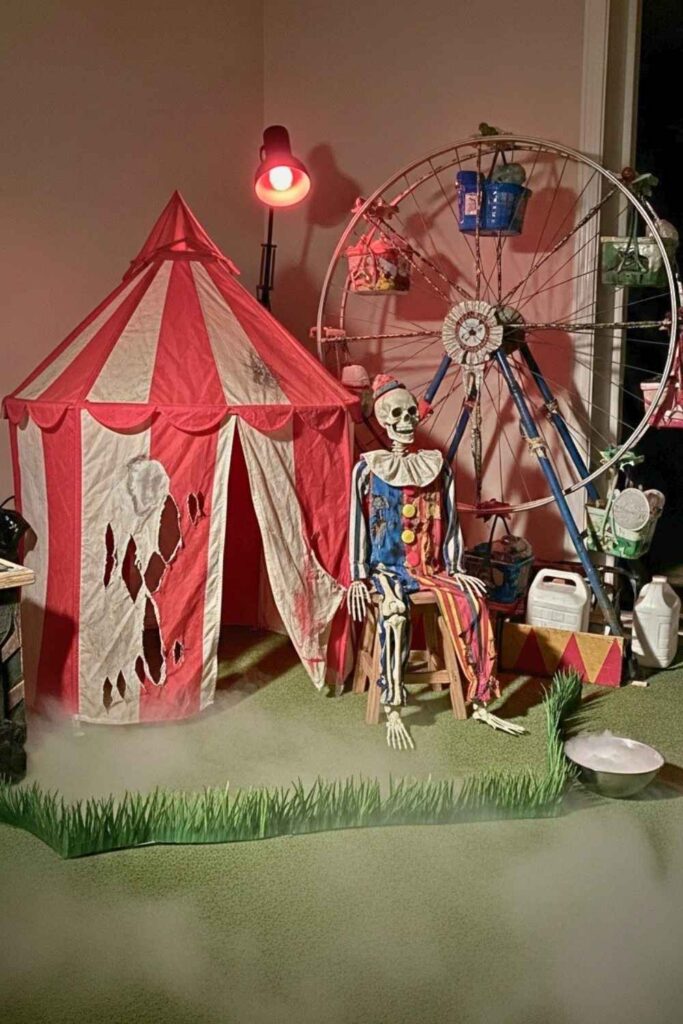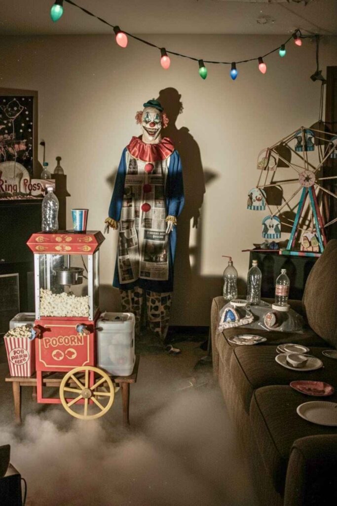 Turn your front yard into a creepy carnival with string lights, tattered banners, and a broken popcorn machine. Add a clown mannequin in the corner for the perfect unsettling touch.