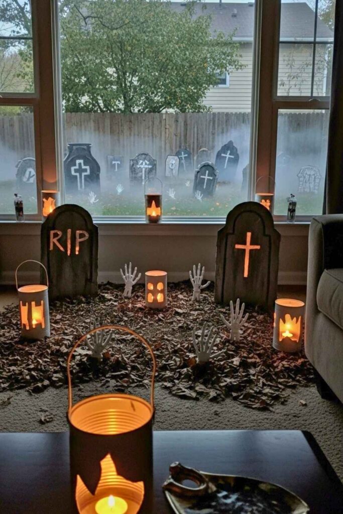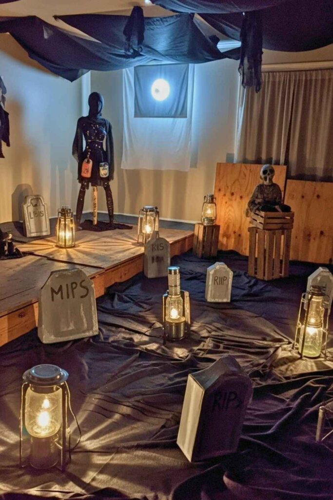 Turn your backyard into a cemetery with fake tombstones, fog machines, and skeletal hands reaching out of the soil. Lanterns glowing by the graves give it an eerie, chilling charm.