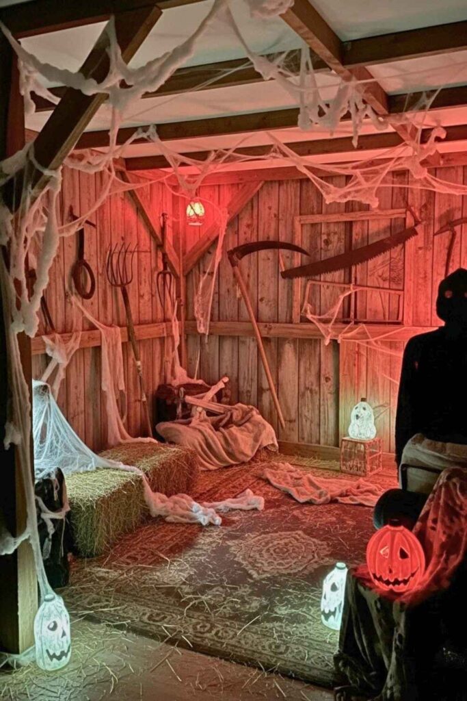 If you have a barn or shed, transform it with hanging ropes, broken tools, and hay scattered across the floor. Dim red lights and distant animal sounds create a chilling farmyard haunt.