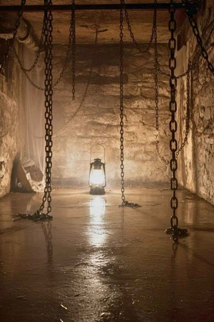 A basement is the perfect place to set the stage with flickering lanterns, rusty chains hanging from beams, and damp stone walls. The echo of footsteps makes it feel like something is following close behind.