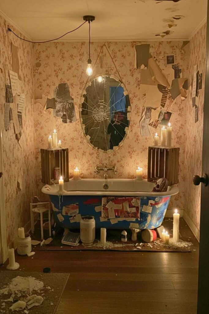 Cover mirrors in aged silver film or crackled stickers, so reflections appear distorted. Place a clawfoot tub filled with red-dyed water and candles surrounding it for a chilling effect.
