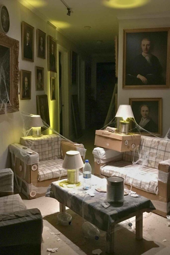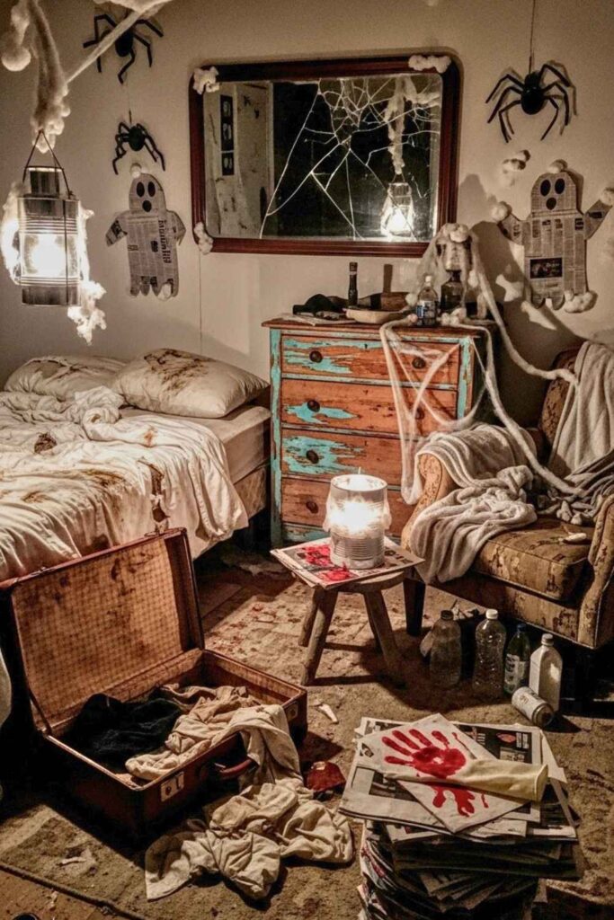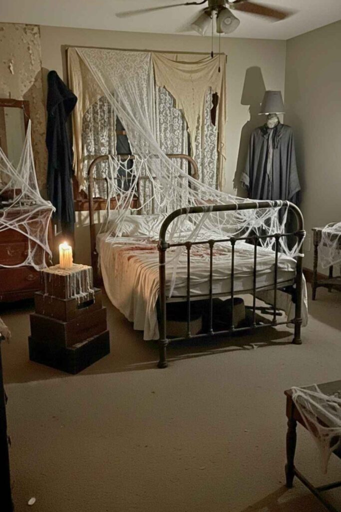 Turn a spare bedroom into a creepy dreamscape with torn lace curtains, a bed draped in cobwebs, and a shadowy figure sitting in the corner. Add faint whispers or music for extra chills.