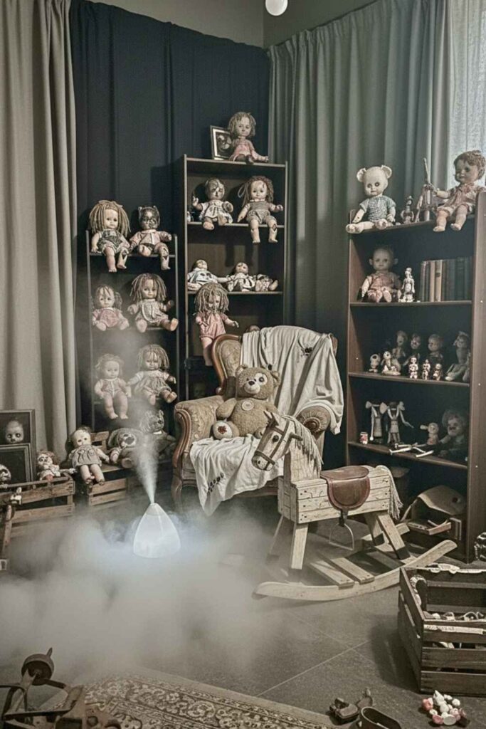 Transform a playroom into a spine-chilling scene with broken toys, headless dolls, and a rocking horse that creaks back and forth. Place eerie lullaby music playing faintly in the background.