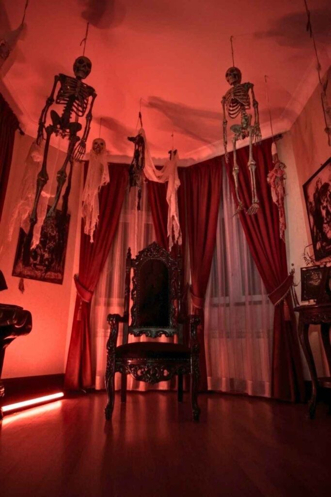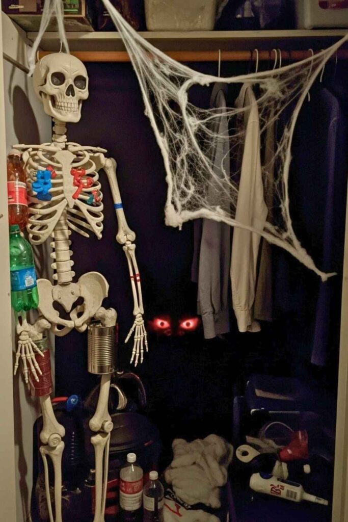 Turn a closet into a terrifying mini-haunt by filling it with fake skeletons, cobwebs, and glowing red eyes peering from the dark.