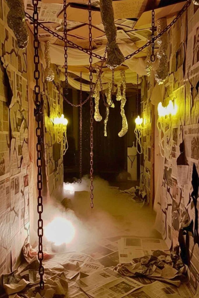 Line a long hallway with dangling chains, flickering lights, and loud echoing footsteps from hidden speakers. Guests will feel trapped in an endless prison passage.