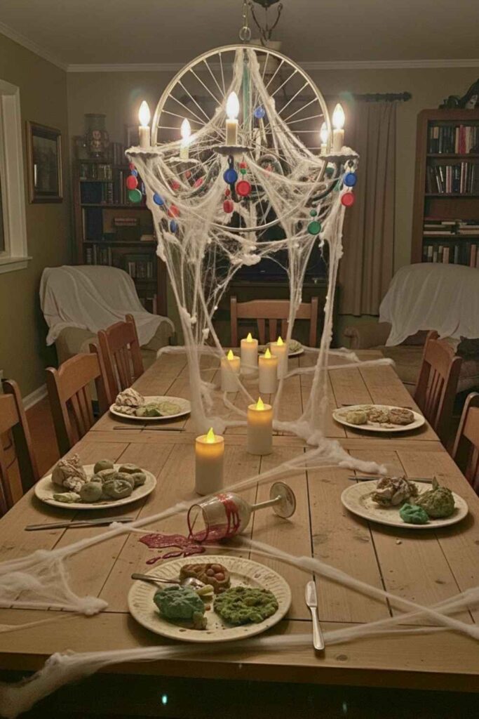 Dress your dining room like a long-forgotten banquet. Plates of fake rotting food, spilled goblets of wine, and candles dripping wax onto dusty silverware make it look like the hosts vanished mid-feast.