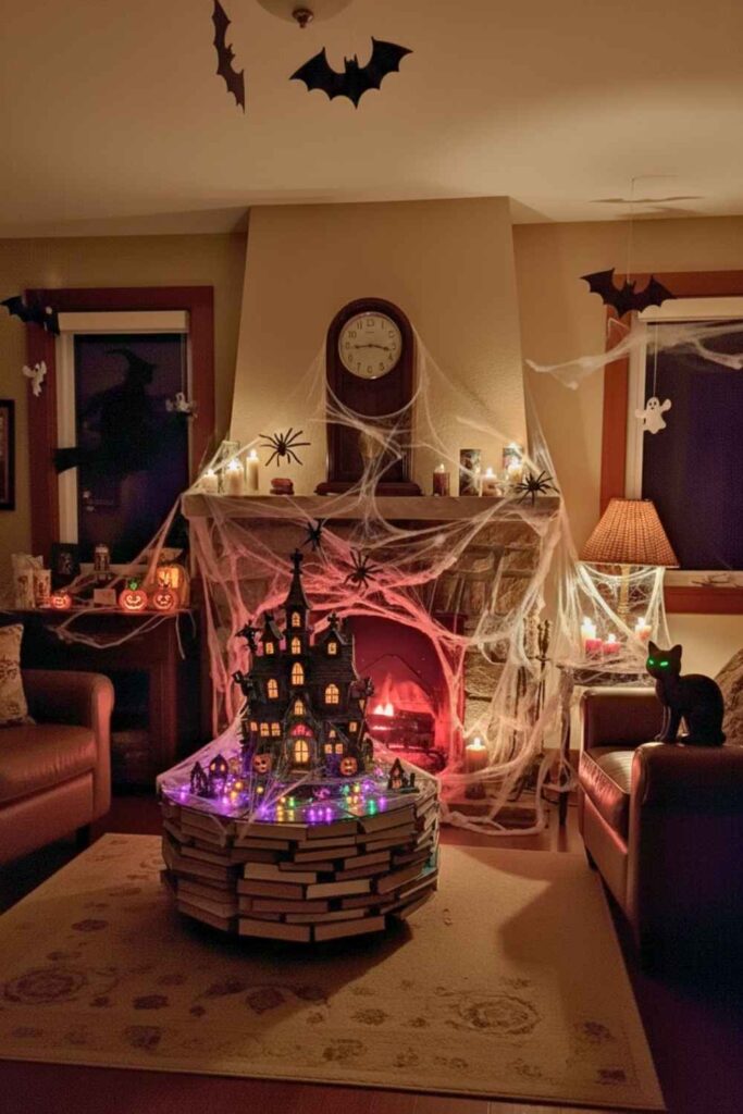 A living room with a fireplace becomes spooky with logs that glow red, as if burning eternally. Cobwebbed mantels, antique clocks, and shadowy lighting make it feel like ghosts gather around the flames.