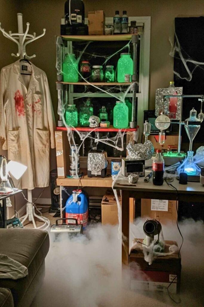 Transform your garage into a mad scientist’s lab with bubbling jars, flickering green lights, and lab coats hanging eerily. Fog rolling across the floor seals the effect.