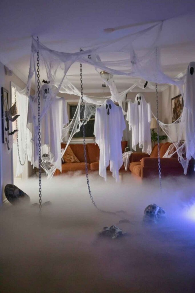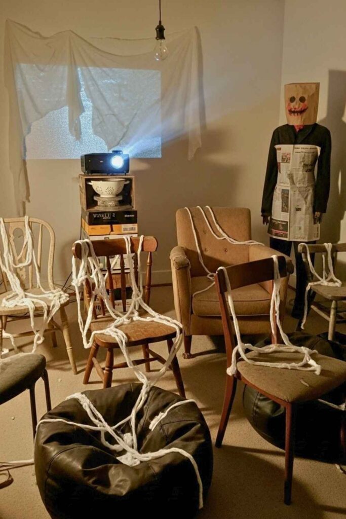 Set up your TV room as if spirits are watching with you. Place old film reels, a projector casting static, and shadowy figures sitting among empty seats.