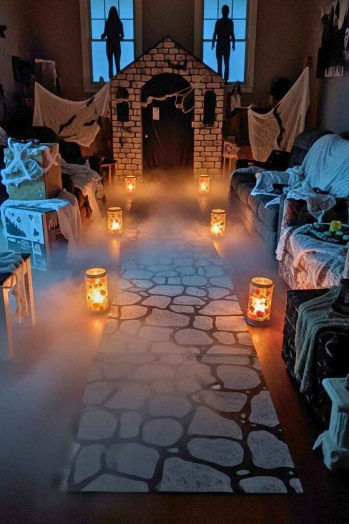 Nothing sets the tone like the entrance. Cover the walkway with fog, dim lanterns, and creepy silhouettes in the windows. Visitors will feel the haunted energy before they step inside.