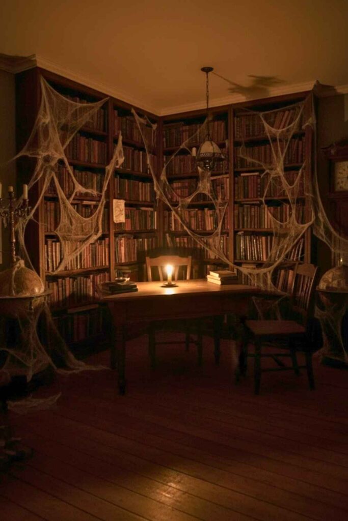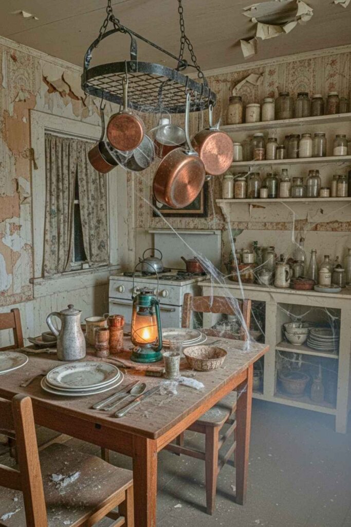 A kitchen can easily feel haunted with flickering lanterns, old copper pots, and a table set with dusty plates as if a ghostly dinner was abandoned. Add an old radio playing static for atmosphere.