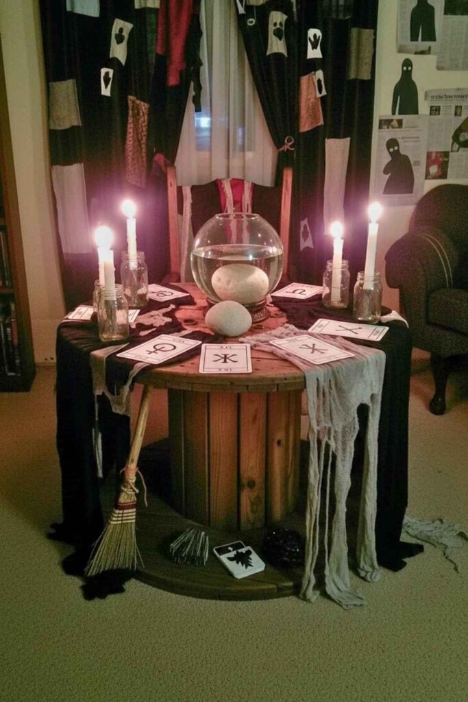 Set up your living room as if a séance is about to begin: a round table, scattered tarot cards, and flickering candles. A glass of wine spilled on the floor makes it feel like spirits interrupted the ritual.