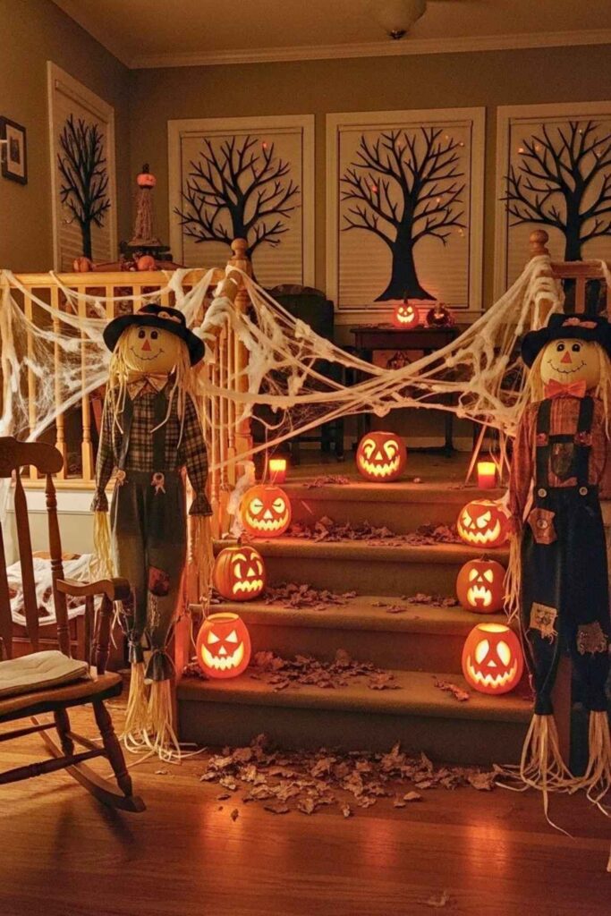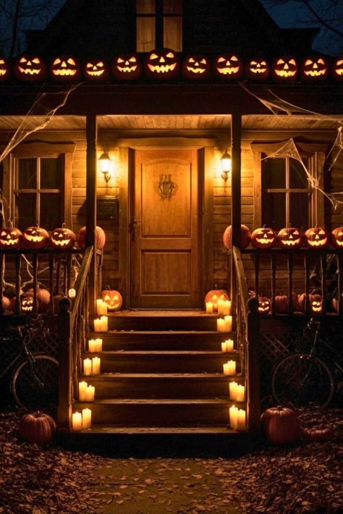 Imagine a front porch overflowing with carved pumpkins, each one glowing with flickering candlelight. Inside, warm orange light bounces off the walls, creating the feeling of being inside a living jack-o’-lantern.