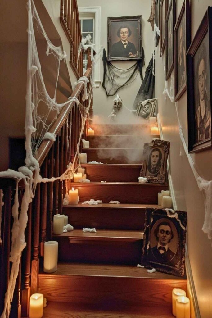 Dress up your staircase with candle jars on each step, portraits on the walls that follow your gaze, and creaking floorboards. A fog machine at the base makes the climb feel endless.