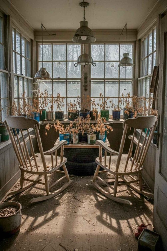 A bright room becomes chilling when filled with dead plants, cracked glass windows, and rocking chairs that face outward. The light feels harsh and ghostly.