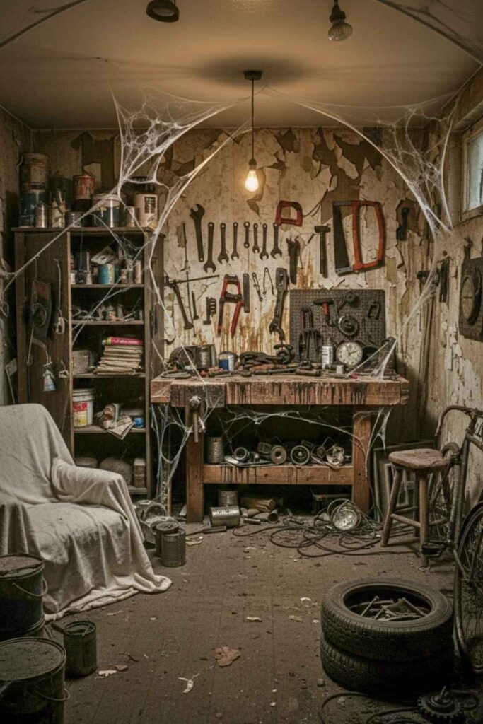 Transform your garage into a tunnel of darkness with fake cobwebs, dangling ghost figures, and blacklight glow. Add a fog machine and eerie sound effects of chains dragging to make guests feel like they’ve stepped into another realm.