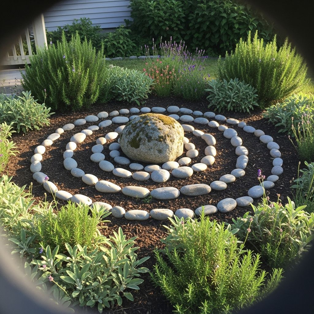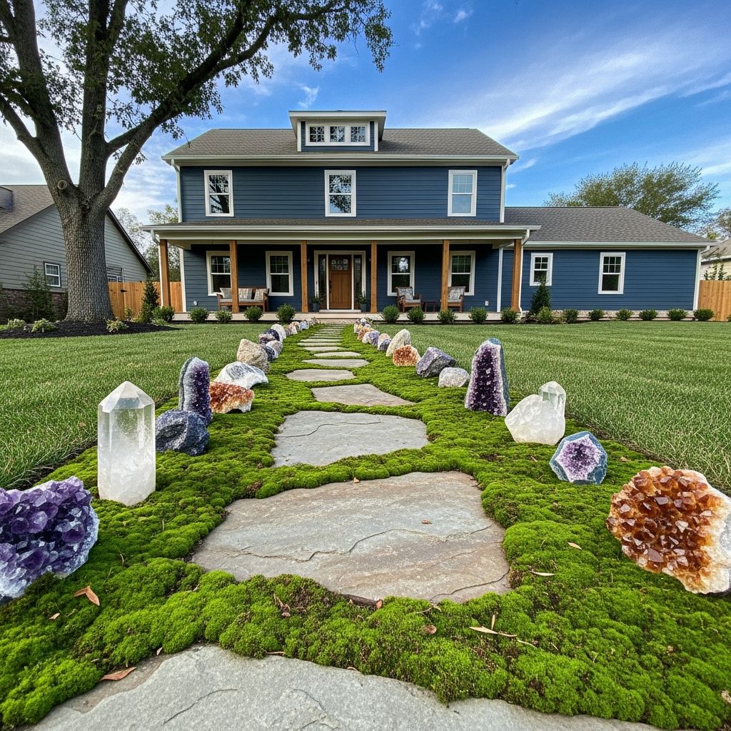 Create an enchanting first impression by lining your front stone path with raw crystals like smoky quartz, clear quartz, and large chunks of amethyst. This not only adds a mystical sparkle to your yard but is also believed by many to protect the home’s energy. Interspersing these stones with low-growing moss and creeping thyme gives the path a weathered, ancient look that feels like a gateway to a hidden forest realm. This setup works beautifully against a wooden or dark-painted American home exterior.