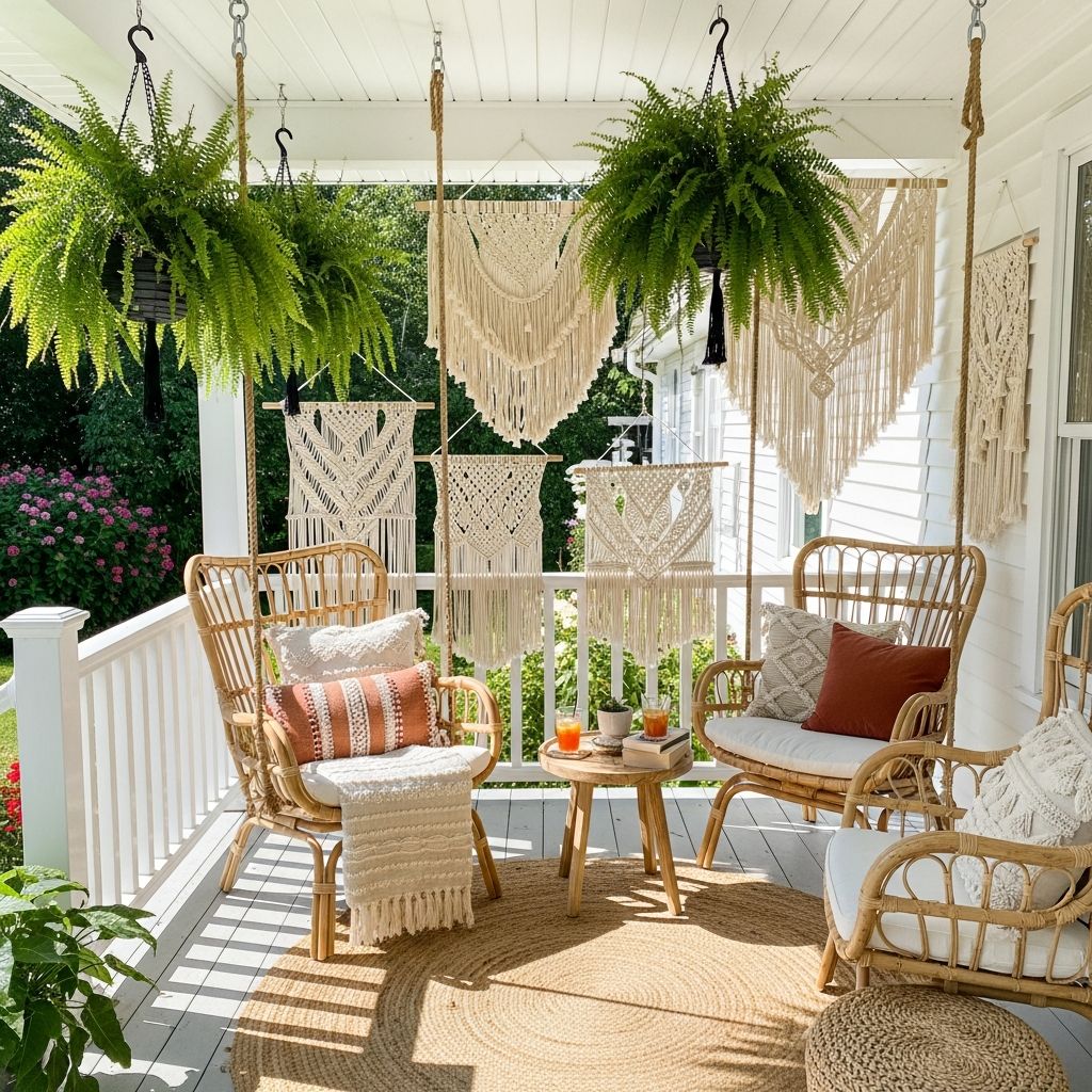 A classic porch can be completely transformed with the addition of oversized cream-colored macramé hangings and a variety of hanging ferns. The soft texture of the woven cotton contrasts beautifully with the jagged leaves of the plants, creating a cozy, bohemian ‘jungle’ vibe. Add a couple of hanging rattan chairs with fringe pillows to encourage long afternoons of reading and reflection. This look is perfect for homeowners who want to maximize their outdoor living space with a relaxed, hippie feel.