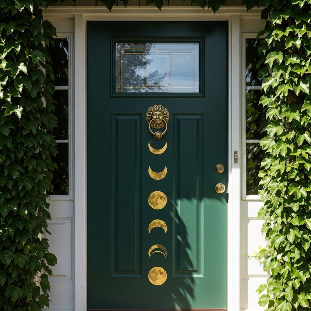 Your front door is the focal point of your home’s exterior, so why not make it celestial? Painting your door in a deep matte charcoal or forest green and adding gold-painted moon phases vertically down the center creates an immediate witchy vibe. Surround the door with climbing ivy or jasmine to soften the look and add a natural fragrance. This simple DIY project can drastically change the personality of a standard American suburban house, making it stand out as a place of mystery and charm.