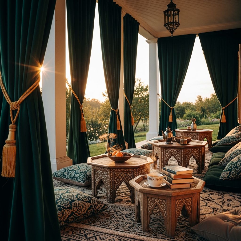 For those with a covered veranda, adding heavy, weather-resistant velvet curtains in jewel tones like emerald, burgundy, or midnight blue can create a luxurious, witchy hideaway. These curtains provide privacy and wind protection while making the outdoor space feel like an extension of an indoor parlor. Pair them with low floor cushions and a carved wooden coffee table for a space that is perfect for tarot readings or evening tea under the stars. It is an opulent take on the bohemian lifestyle.