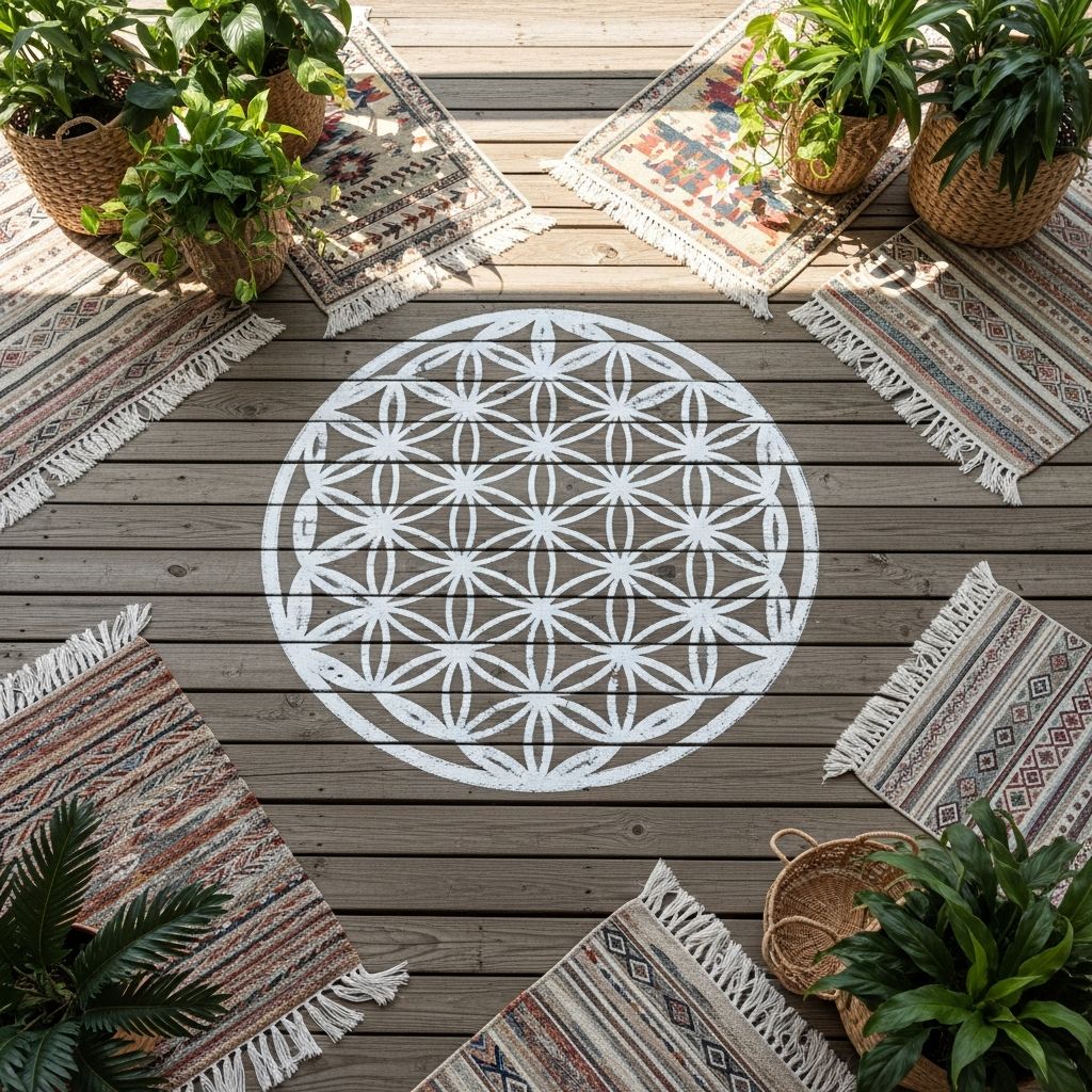 Use your porch floor as a canvas by painting or chalking intricate sacred geometry symbols, such as the Flower of Life or a Metatron’s Cube. If you prefer something less permanent, using outdoor-safe chalk allows you to change the symbols with the seasons or moon phases. This grounding practice turns the entrance of your home into a literal ‘magic circle,’ setting a spiritual tone before anyone even enters. It looks particularly striking on dark-stained wood or grey concrete porches.