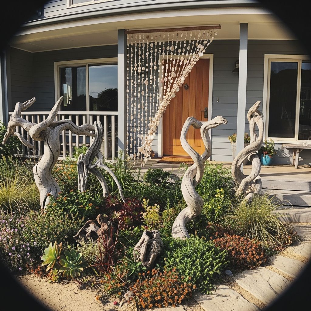 For a ‘sea witch’ or coastal hippie vibe, decorate your exterior with elements found in nature. Large pieces of sun-bleached driftwood can be used as sculptural elements in the garden, while delicate wind chimes made from oyster shells or sea glass can be hung from trees. These materials bring the calming energy of the ocean to your home’s exterior, regardless of how far you live from the coast. The soft clinking of shells and the weathered texture of wood create a peaceful, meditative environment.