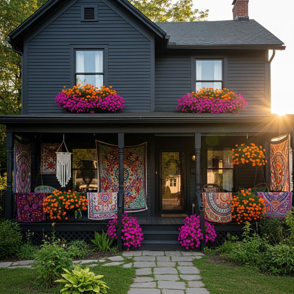 Combine the ‘witchy’ dark aesthetic with ‘hippie’ brightness by painting your house trim or siding black and then decorating with an explosion of colorful flowers and fabrics. Vibrant orange marigolds, purple petunias, and multi-colored tapestries hung over porch railings pop brilliantly against a dark background. This high-contrast look is sophisticated yet playful, proving that you don’t have to choose between a moody aesthetic and a cheerful one. It is a bold statement that reflects a complex, magical personality.