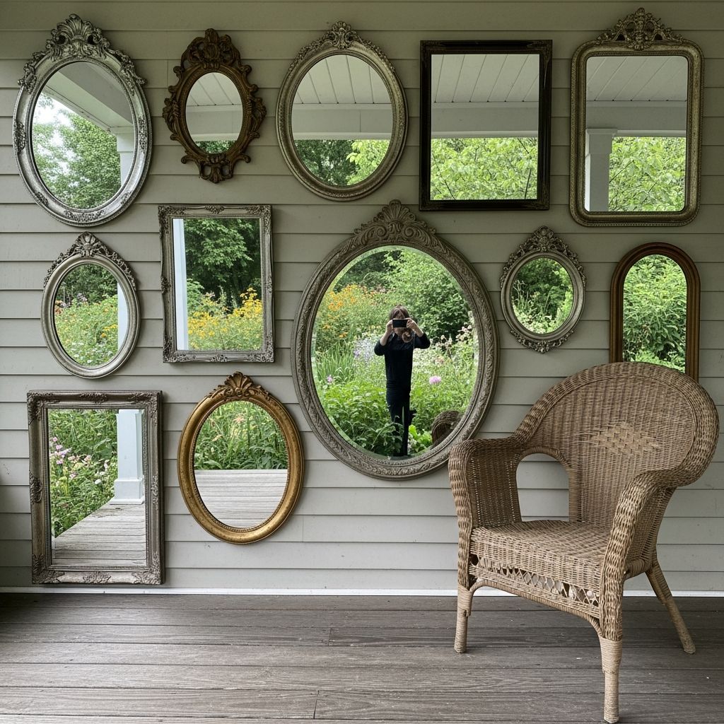 Hanging vintage, weathered mirrors on the exterior walls of your porch is a classic witchy design trick. The mirrors reflect the greenery of your garden, making the space feel larger and more immersed in nature. Opt for ornate brass frames with a bit of patina to add a sense of history. Beyond the aesthetic, mirrors are often used in folklore to reflect away negative energy, making them a functional piece of spiritual decor for your home’s ‘shield.’