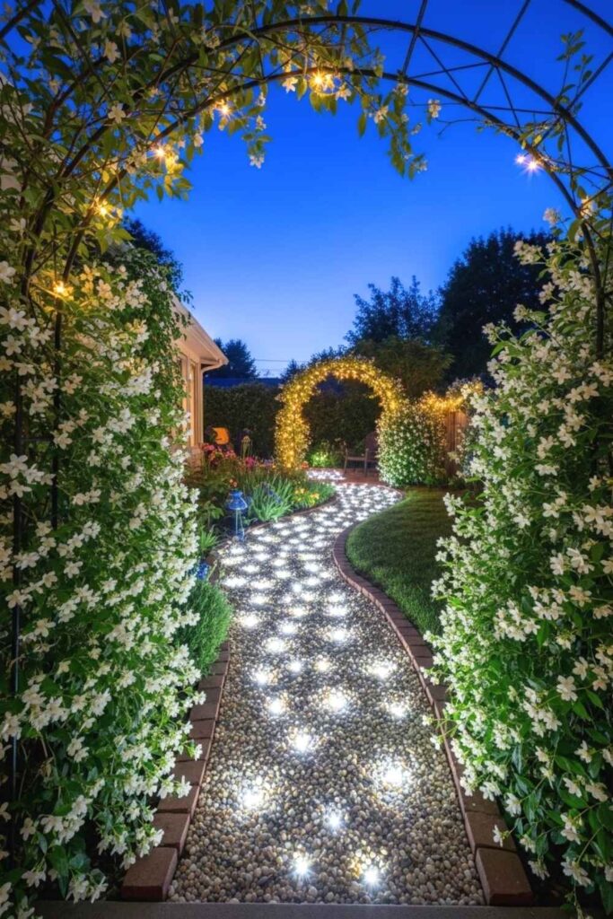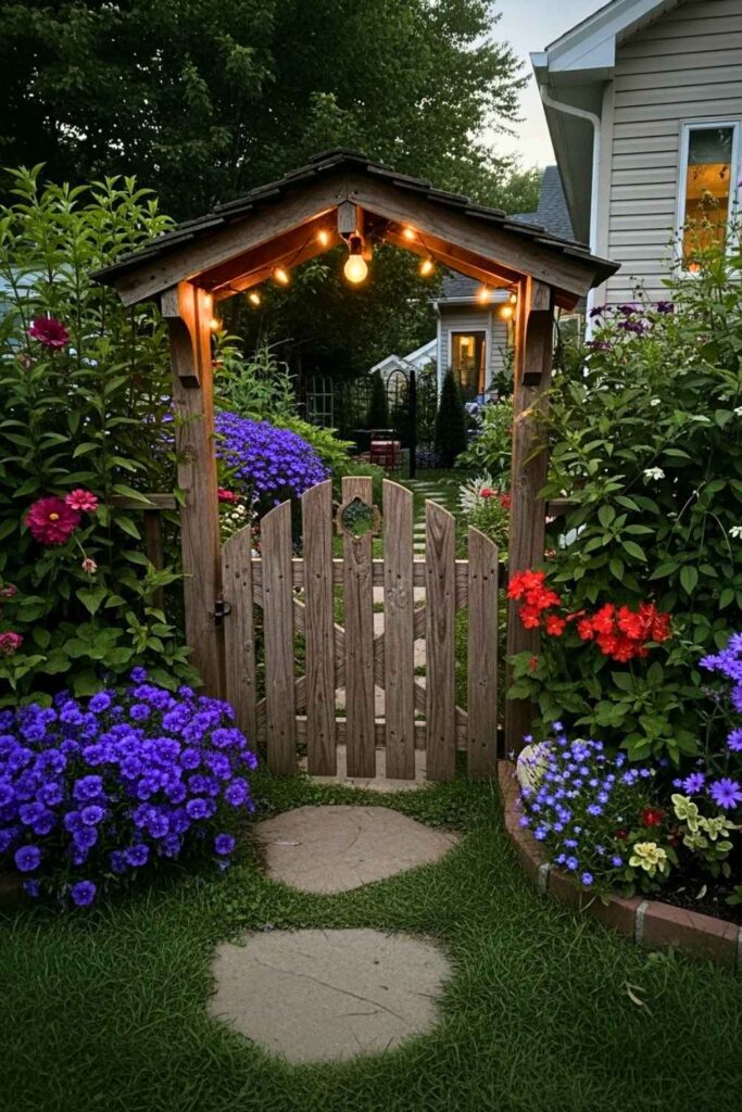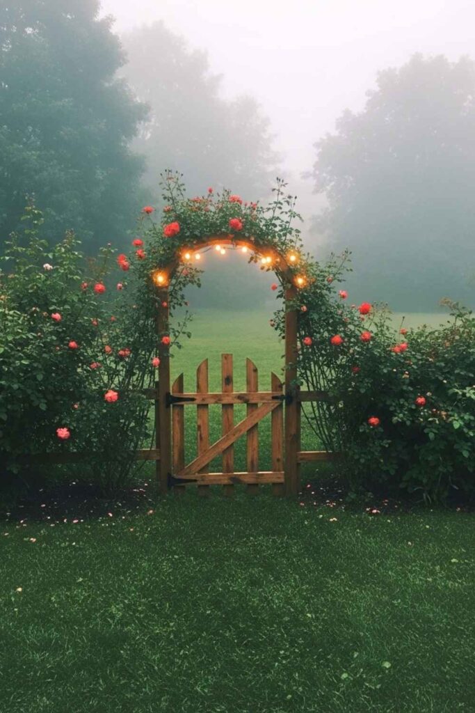 Use solar string lights and climbing clematis or honeysuckle. Add a curved top gate or paint it forest green for extra charm.