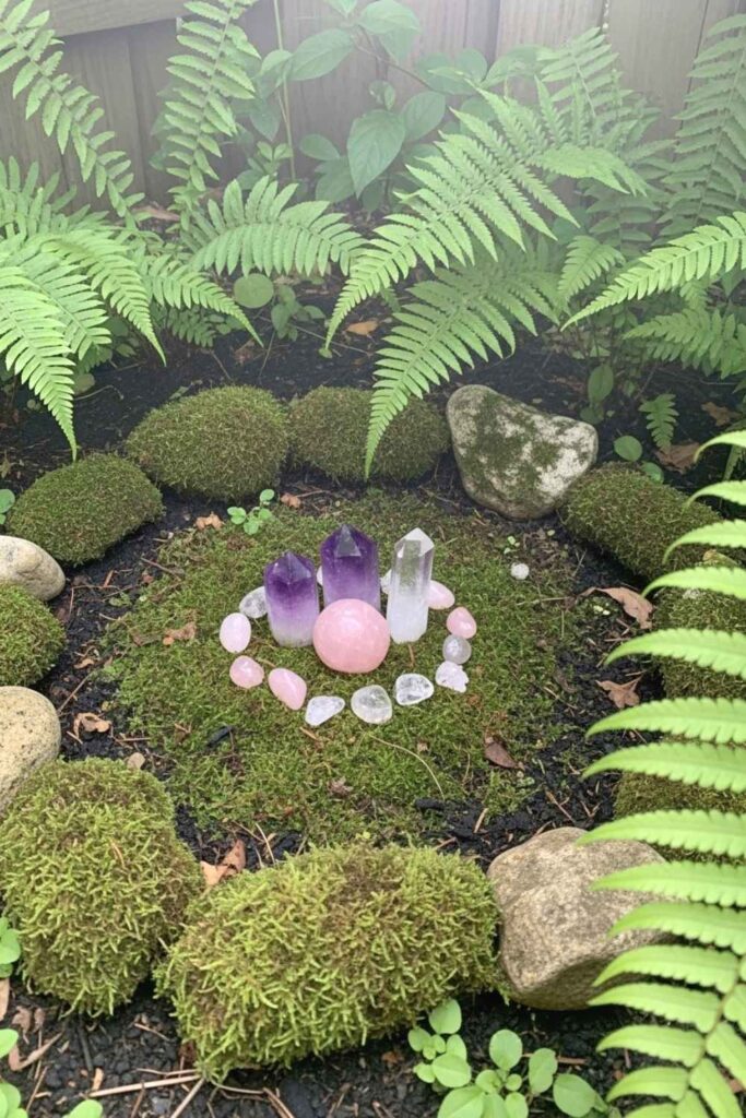Tuck a collection of crystals into a quiet corner of your garden. Use amethyst for protection, rose quartz for love, and clear quartz for clarity. Place them on mossy stones, inside old birdbaths, or around the base of trees to let them charge under the elements.