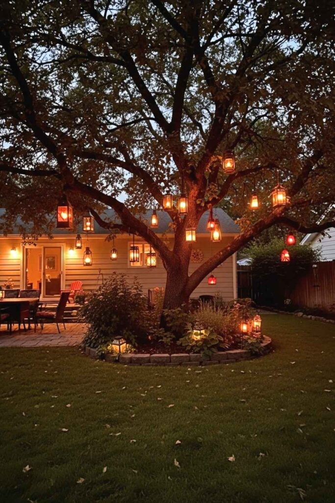 A tall tree adorned with hanging lanterns creates a cozy canopy of light as the sun sets. The flickering glow turns your garden into an evening retreat.