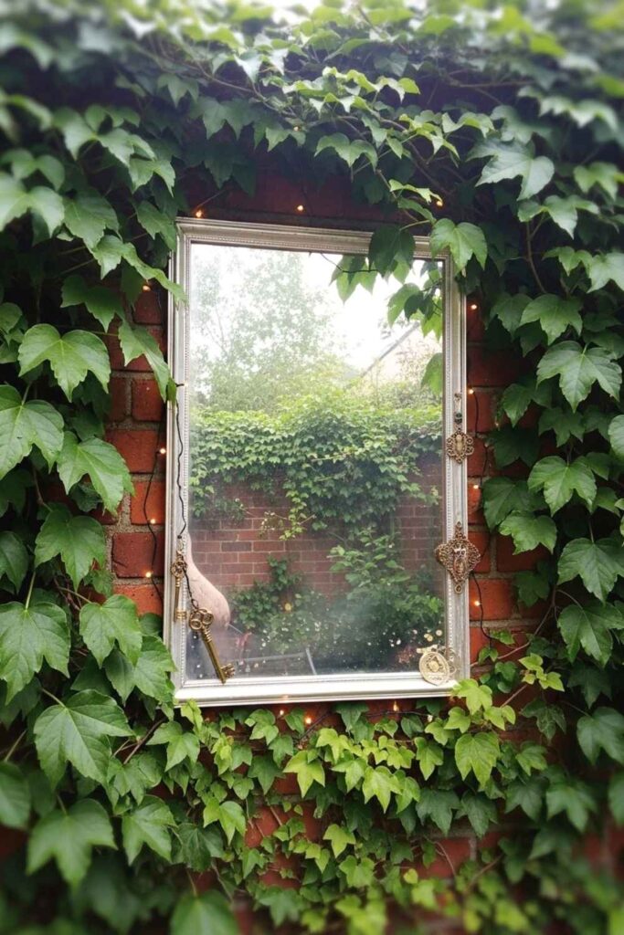 Hang a vintage mirror or several small ones on a garden fence or tree to create the illusion of a hidden portal. When the light hits just right, it feels like another realm is peeking through—one filled with mystery and possibilities.