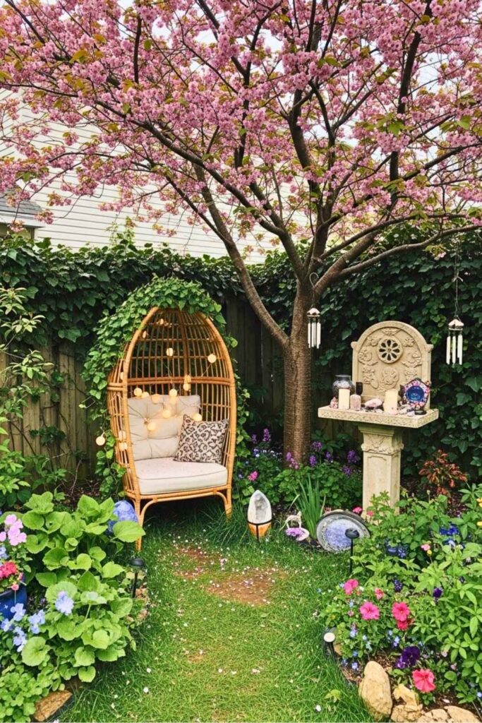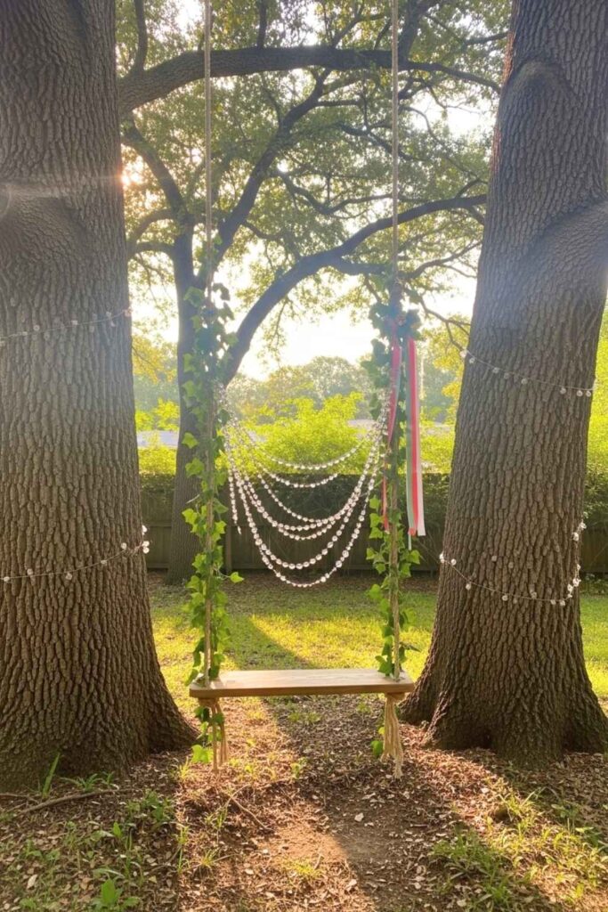 There’s something so nostalgic and freeing about a garden swing. Hang it between two old trees, and then add trailing ivy, delicate ribbons, and maybe even some hanging crystals that catch the sunlight. It’s a seat for daydreaming, healing, or simply soaking in the beauty around you.