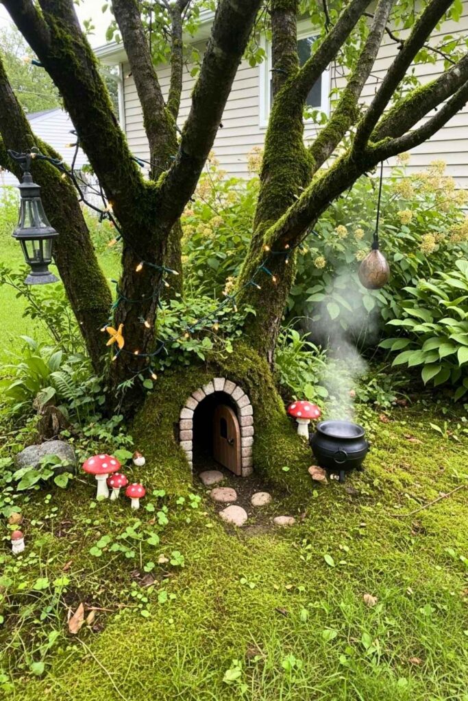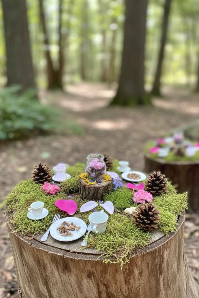 If you have an old tree stump, transform it into a fairy-sized table. Decorate it with tiny dishes, dried petals, pinecones, and moss. Leave little “offerings” like honey or shiny stones as a playful tribute to the unseen garden spirits.